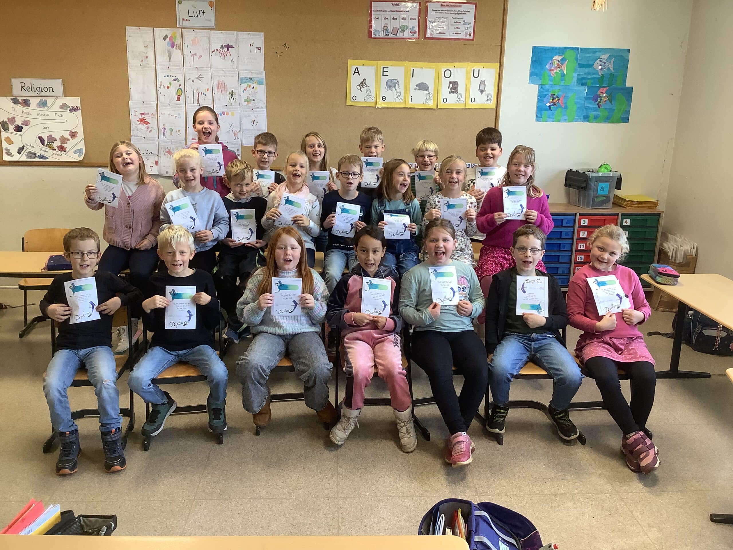 Stolz waren die Kinder der Klassen 2a, 2b und 2c, als sie aus den Händen ihrer Klassenlehrkräfte Frau Schlömer, Frau Remmers und Herrn Vetterlein jeweils eine Urkunde erhielten. Diese bescheinigte ihnen nämlich den Erwerb des Füllerführerscheins. Zuvor hatten die Kinder wochenlang geübt, sauber mit dem Füller zu schreiben, um am Ende eine Prüfung zu bestehen. Herzlichen Glückwunsch!