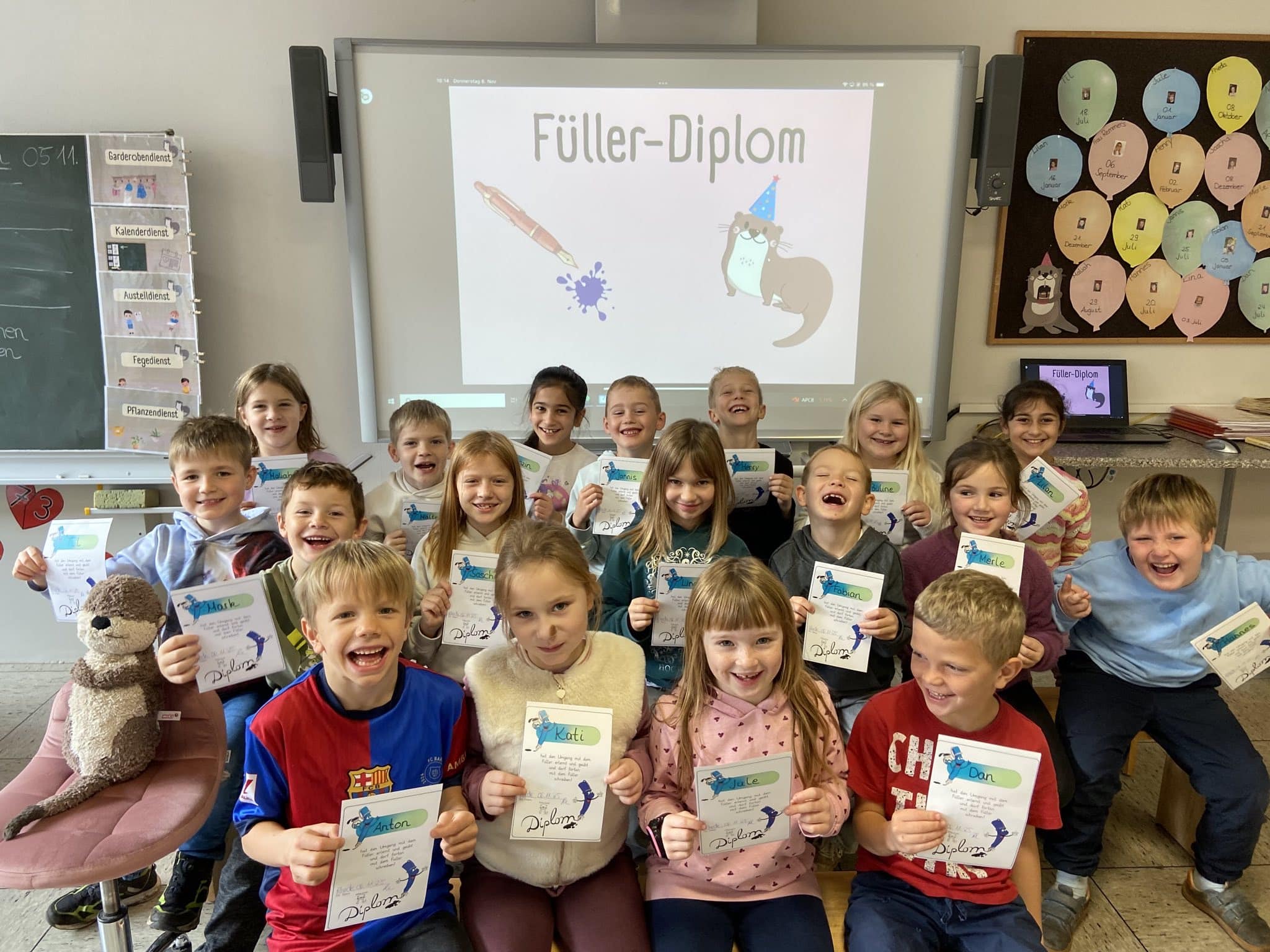 Stolz waren die Kinder der Klassen 2a, 2b und 2c, als sie aus den Händen ihrer Klassenlehrkräfte Frau Schlömer, Frau Remmers und Herrn Vetterlein jeweils eine Urkunde erhielten. Diese bescheinigte ihnen nämlich den Erwerb des Füllerführerscheins. Zuvor hatten die Kinder wochenlang geübt, sauber mit dem Füller zu schreiben, um am Ende eine Prüfung zu bestehen. Herzlichen Glückwunsch!