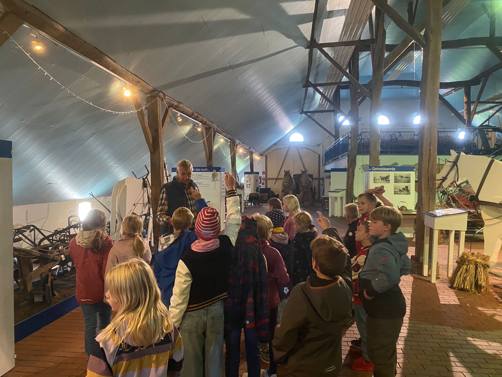 Bei der umfangreichen Führung durch Herrn Theo Kroll und Herrn Gerd Specker-Dünhöft wurde vor allem die technische Weiterentwicklung der landwirtschaftlichen Geräte erlebbar. Angeleitet entdeckten die Kinder die Unterschiede und Veränderungen zwischen Mähmaschine, Mähbinder und Dreschmaschine bis hin zum modernen Mähdrescher, der alle nötigen Arbeitsschritte in einem Arbeitsgang erledigt. Alte Werkzeuge und schwere Maschinen, mit denen die Landwirte vor 75 bis 150 Jahren gearbeitet haben, brachten einige Schülerinnen und Schüler zum Staunen. Dabei wurde ersichtlich, dass früher viel Handarbeit bei der Ackerbestellung und der Getreideernte nötig war und deutlich mehr Menschen in der Landwirtschaft arbeiteten. Eindrücklich erkannten die Kinder, dass das Leben und Arbeiten in der Landwirtschaft sehr anstrengend und mühsam war.