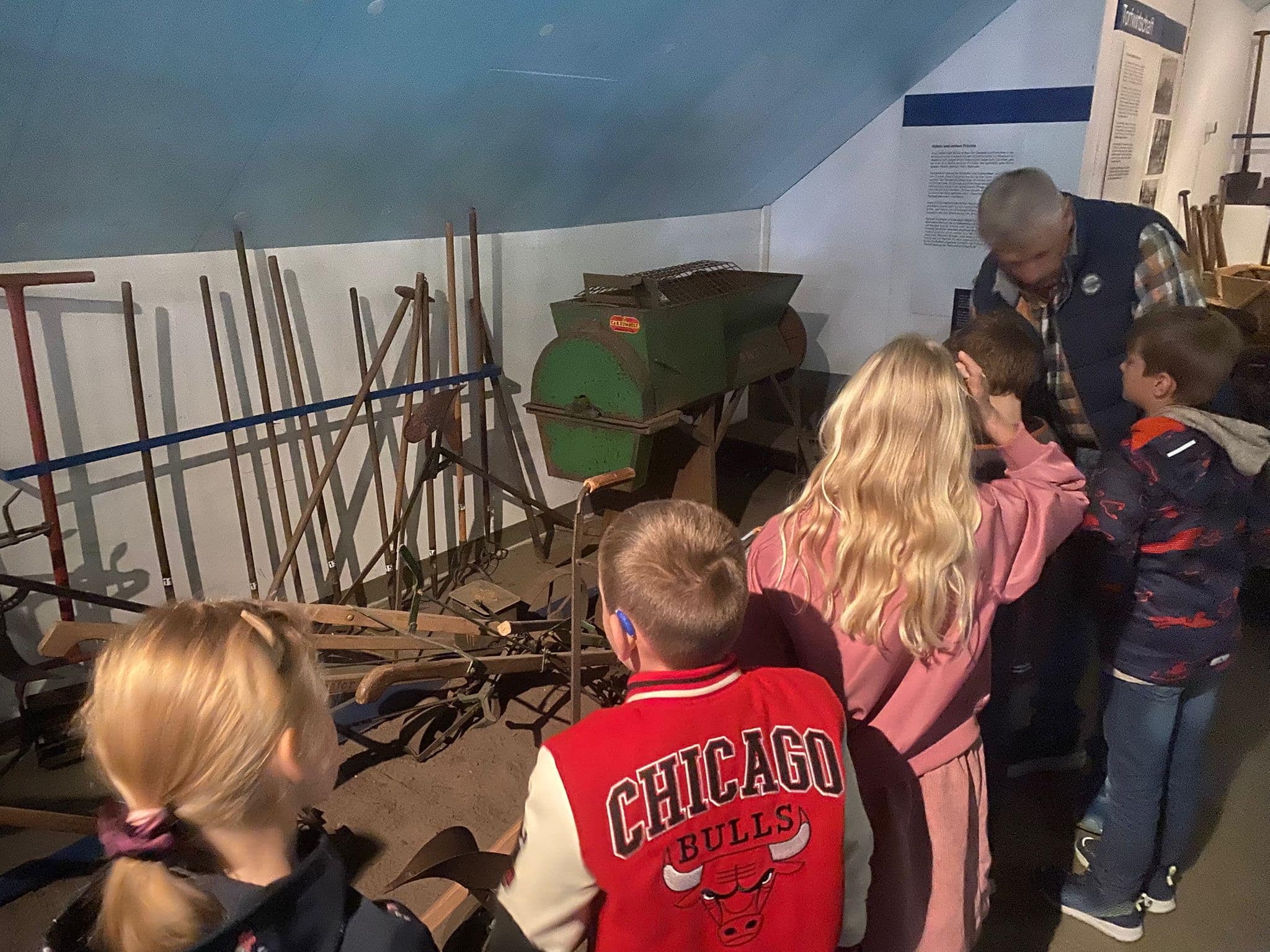 Bei der umfangreichen Führung durch Herrn Theo Kroll und Herrn Gerd Specker-Dünhöft wurde vor allem die technische Weiterentwicklung der landwirtschaftlichen Geräte erlebbar. Angeleitet entdeckten die Kinder die Unterschiede und Veränderungen zwischen Mähmaschine, Mähbinder und Dreschmaschine bis hin zum modernen Mähdrescher, der alle nötigen Arbeitsschritte in einem Arbeitsgang erledigt. Alte Werkzeuge und schwere Maschinen, mit denen die Landwirte vor 75 bis 150 Jahren gearbeitet haben, brachten einige Schülerinnen und Schüler zum Staunen. Dabei wurde ersichtlich, dass früher viel Handarbeit bei der Ackerbestellung und der Getreideernte nötig war und deutlich mehr Menschen in der Landwirtschaft arbeiteten. Eindrücklich erkannten die Kinder, dass das Leben und Arbeiten in der Landwirtschaft sehr anstrengend und mühsam war.