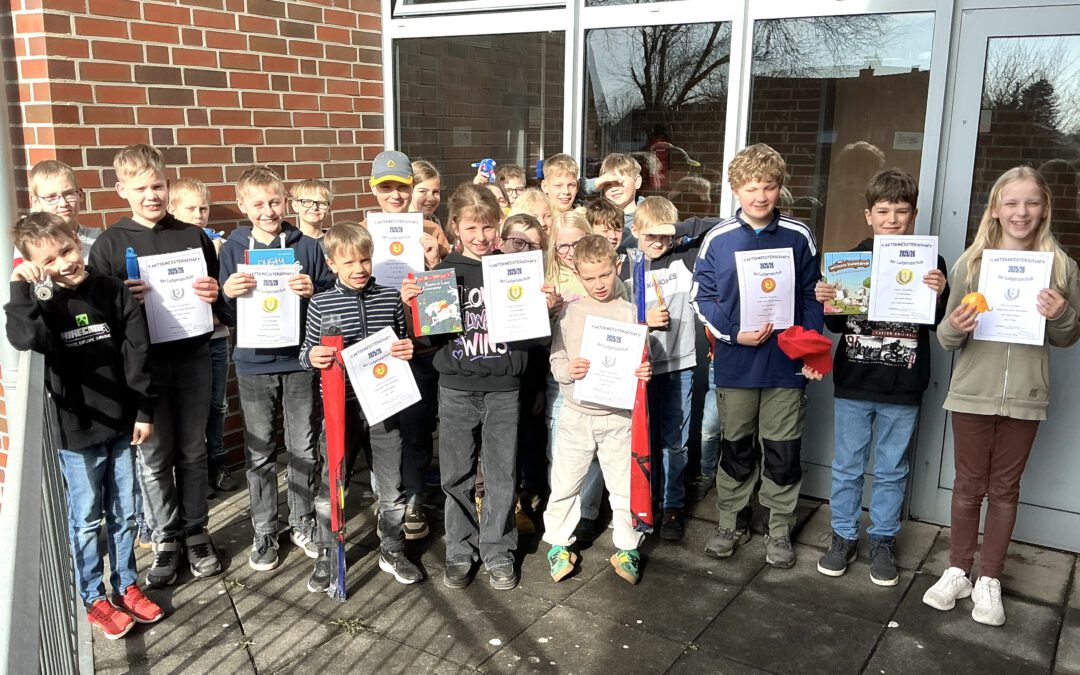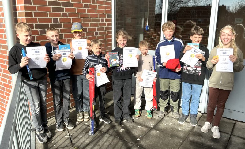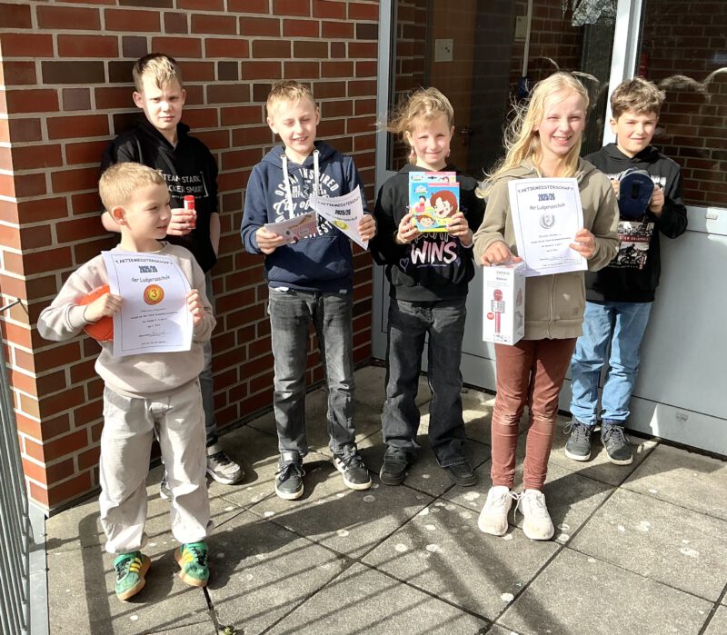 Nike Willerding, Fabian Wojtas, Elias Hunfeld, Jost Janssen, Leon Stubbe und Maira Vinke, die unsere Schule am 24. April 2026 bei der Taktik-Stadtmeisterschaft in Papenburg vertreten werden, spielten anschließend noch um die Schulmeisterschaft der Klassen 2 bis 4. Dabei belegte Fabian Wojtas nach einem spannenden Stechen den dritten Platz. Maira Vinke wurde Vizemeisterin und Elias Hunfeld ging ohne Spielverlust klar als Gesamtsieger hervor.